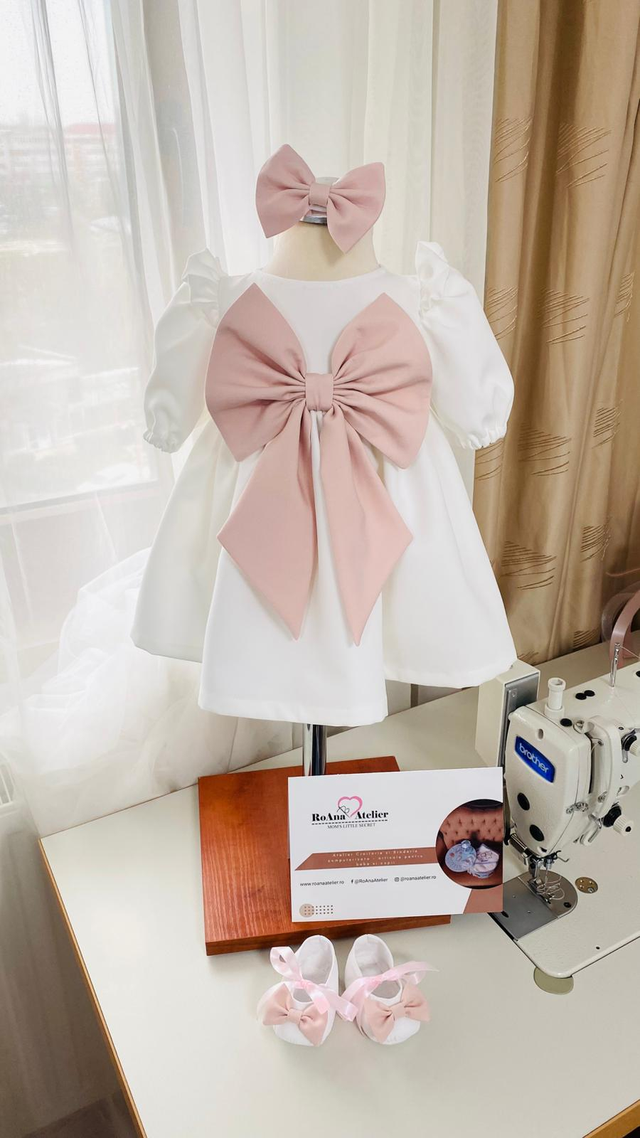 Set Rochiţă albă Linda cu fundita roz prafuit formata din rochita, bentita si botosei asortati. Sunt confecționate din stofita subtire, moale și plăcută la atinger.
