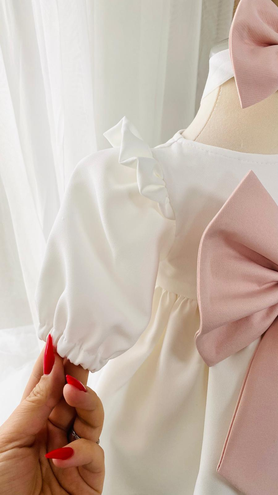 Rochita alba este prevazuta cu o fundă supradimensionată roz prafuit in partea din fata si cu volanase pe umeri. Rochiţa se inchide la spate cu năsturei asortati. Aceasta se realizeaza cu maneca lunga sau scurta in functie de anotimp si preferinta, fara sa se modifice pretul.