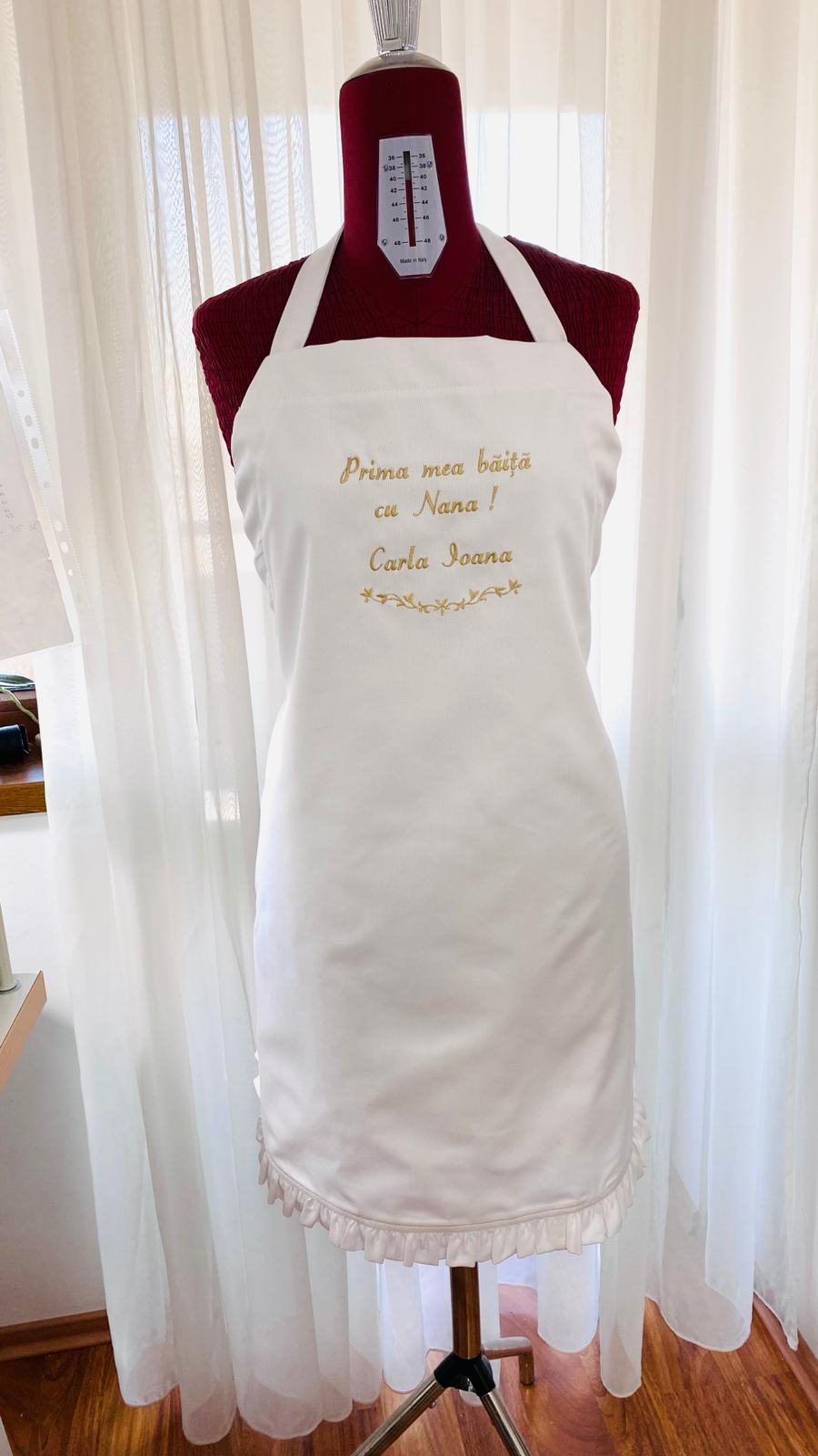 Sort alb Prima Baita Nana brodat cu un mesaj adorabil și emoționant – "Prima mea baita cu Nana !" si personalizat cu numele bebelusului. Acest șorț este mai mult decât un simplu accesoriu, este un simbol al iubirii și recunoștinței, purtat de Nana în timpul primei băițe a finuțului / finuței după botez.