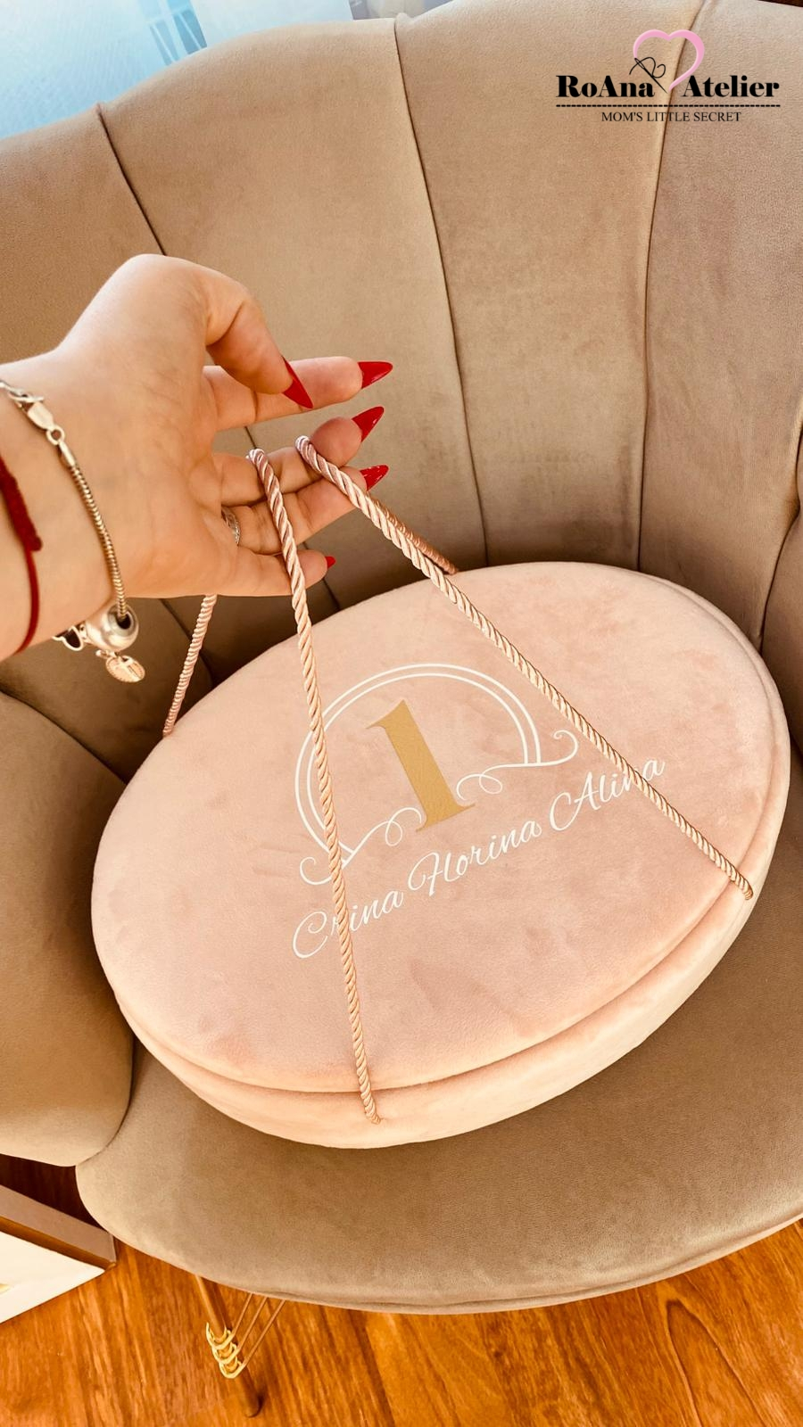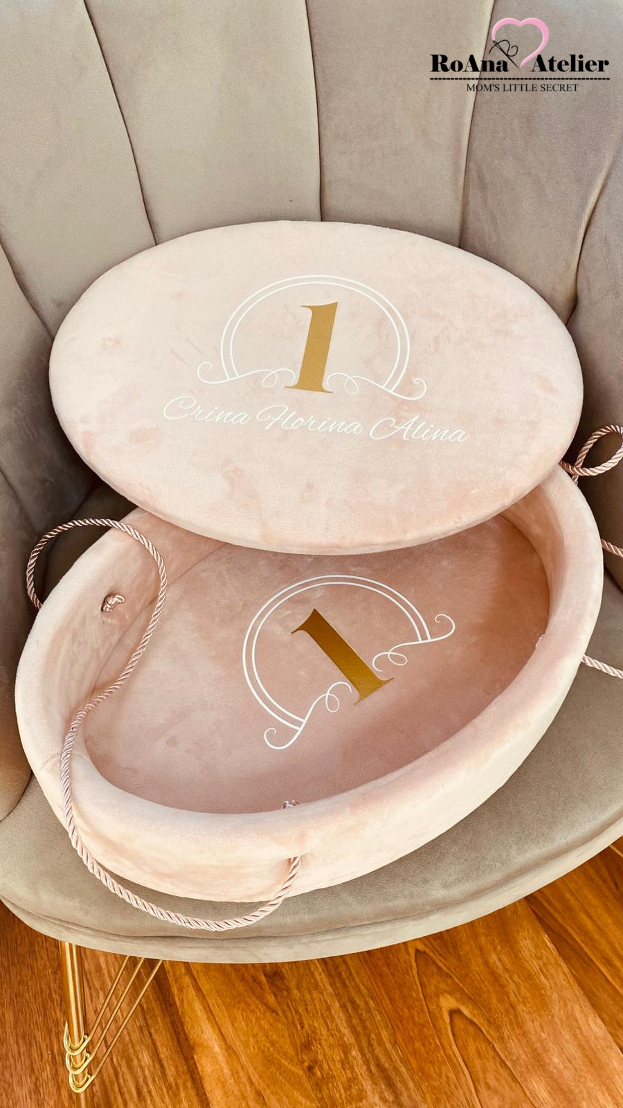 Set Tavita Cu Capac Roz 1 Anisor pentru moț / ruperea turtei format din 2 piese: taviță realizată din catifea fină, nuanta roz prăfuit, cu margini buretate și capac elegant, gândită special pentru primul aniversar al copilului tău.
