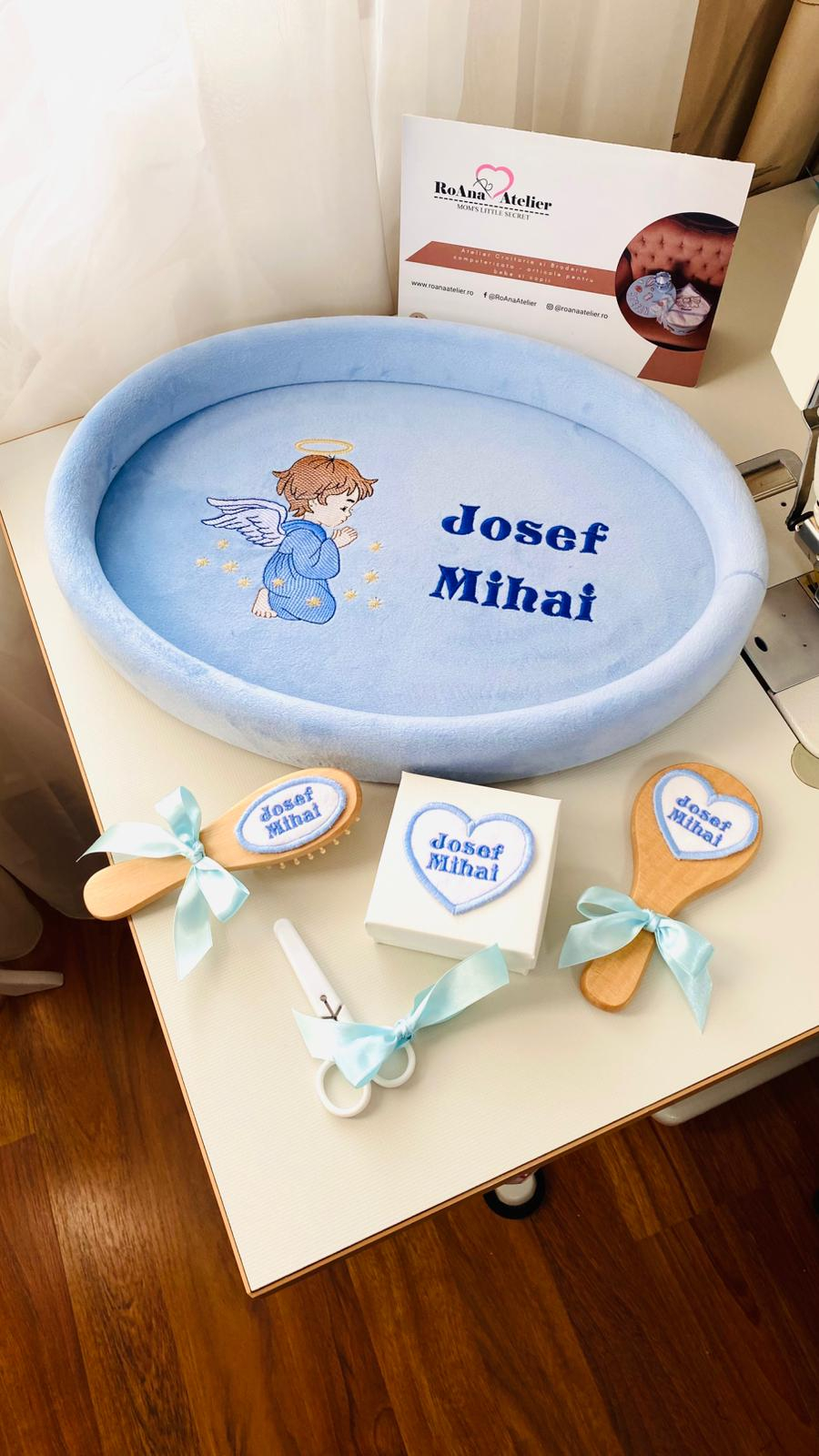 Set Tăviță Bleu pentru Tăierea Moțului – model Ingeraș cu 5 accesorii incluse. Tavita este realizata manual din catifea moale bleu, brodată cu un ingeras și personalizată cu numele copilului. Acest set transformă momentul tradițional al tăierii moțului într-o amintire prețioasă, plină de culoare și emoție.