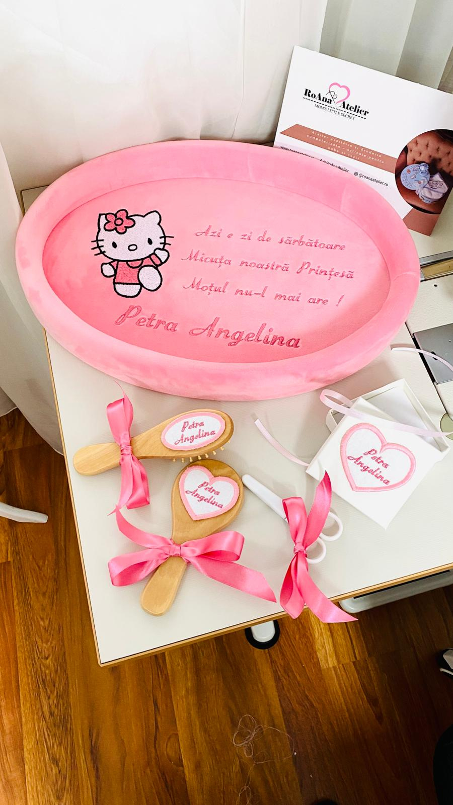 Tăviță cu margini buretate din catifea premium roz intens, brodată cu o simpatica pisicuta Hello Kitty și personalizată cu numele fetitei și mesaj aniversar (Azi e zi de sarbatoare | Micuta noastra Printesa | Motul nu-l mai are!)