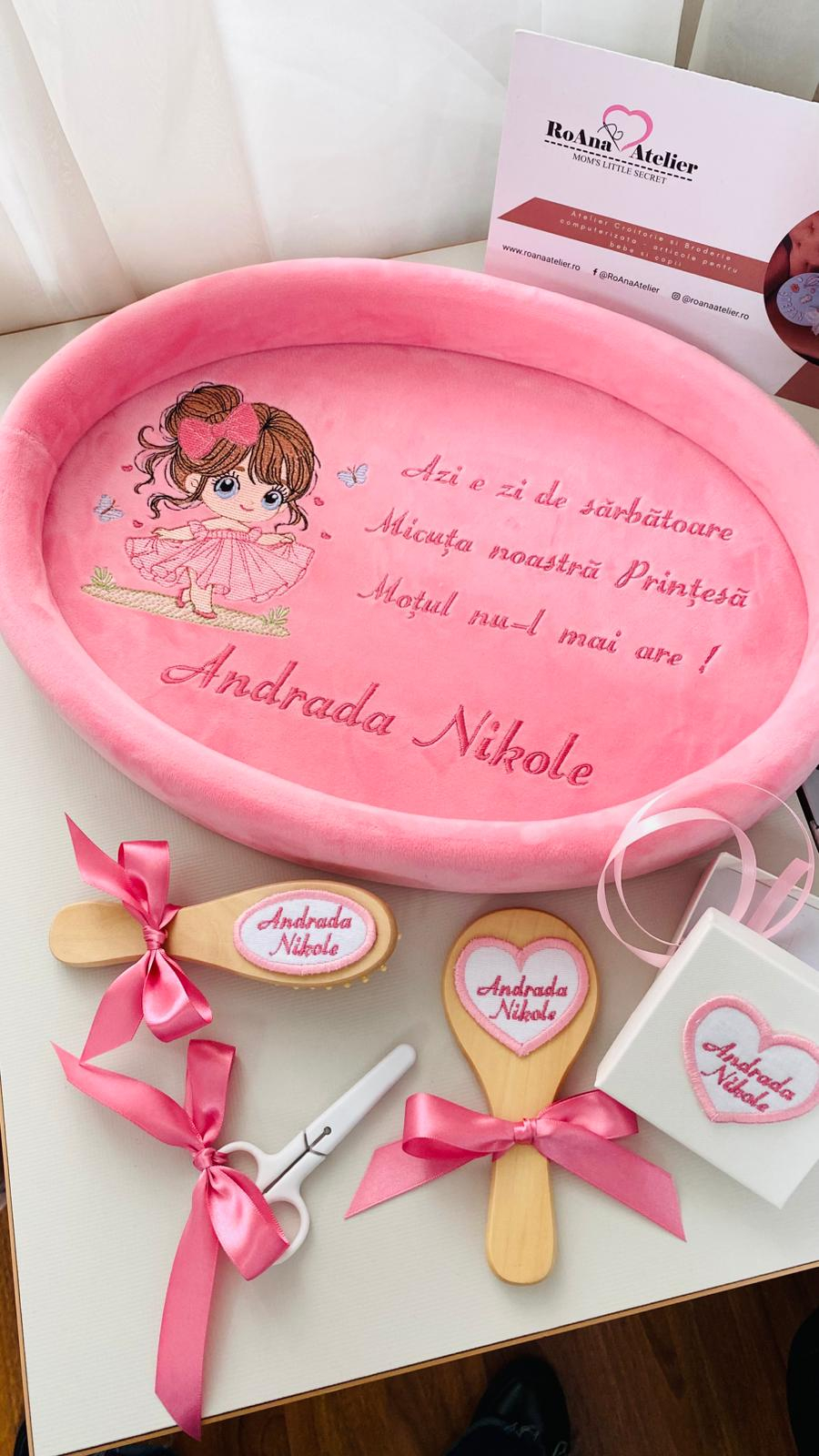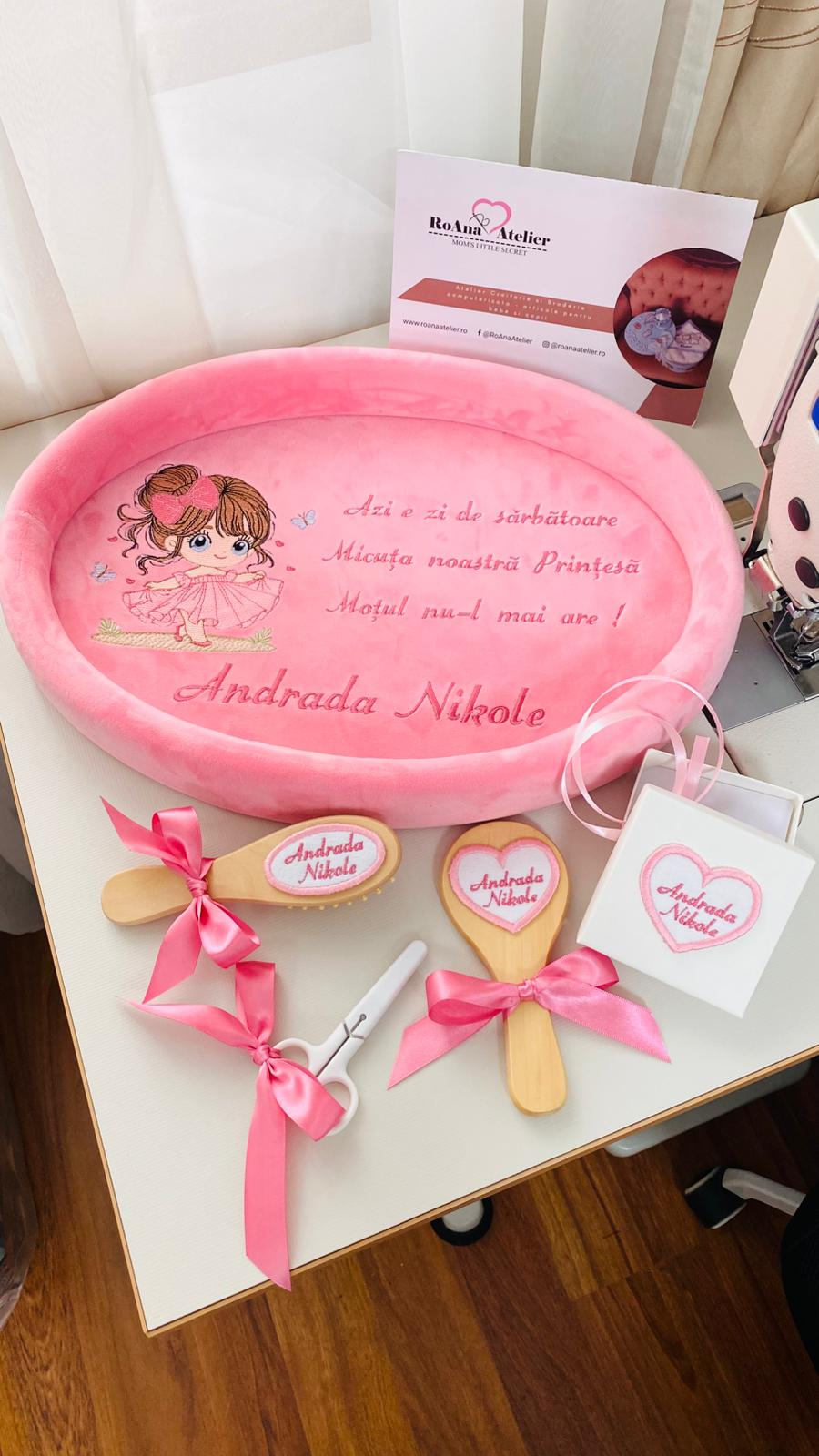 Tăviță cu margini buretate din catifea premium roz intens, brodată cu o delicata Prințesă și personalizată cu numele fetitei și mesaj aniversar (Azi e zi de sarbatoare | Micuta noastra Printesa | Motul nu-l mai are!)