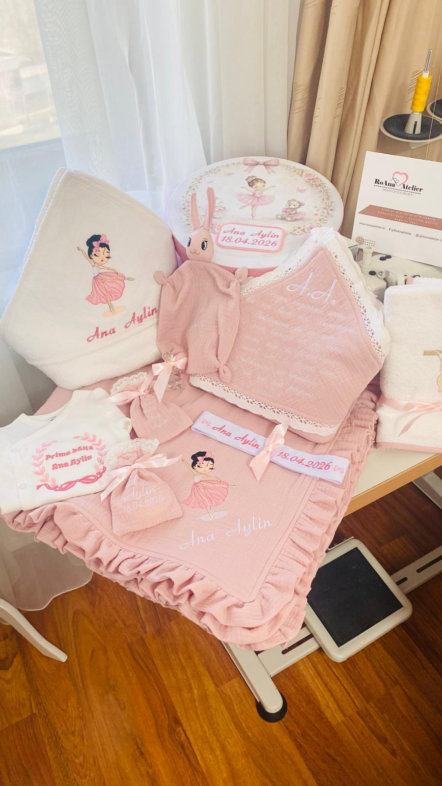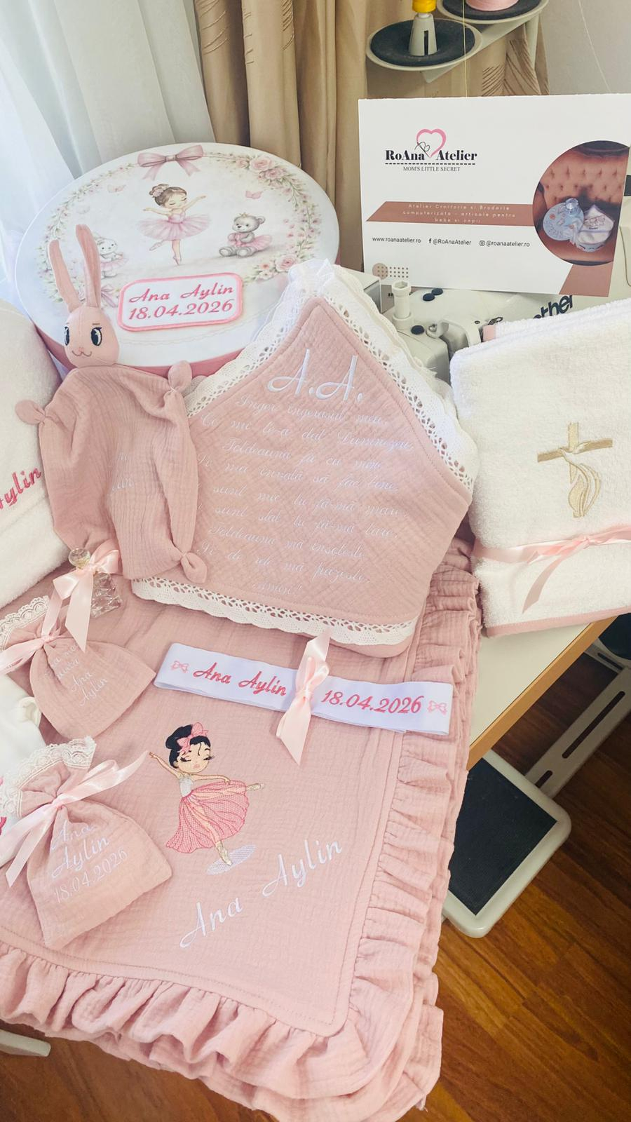 Trusou Botez Muselina Balerina Roz Pudrat pentru fetite, lucrat din muselină premium roz prăfuit, 100% bumbac si dantela, cu o tematică jucăușă și elegantă - balerina. Muselina aerisită și delicată, îmbrățișează pielea bebelușului, iar broderiile fine in nuante de roz trandafiriu, dar și personalizarea transformă fiecare piesă într-o amintire irepetabilă.