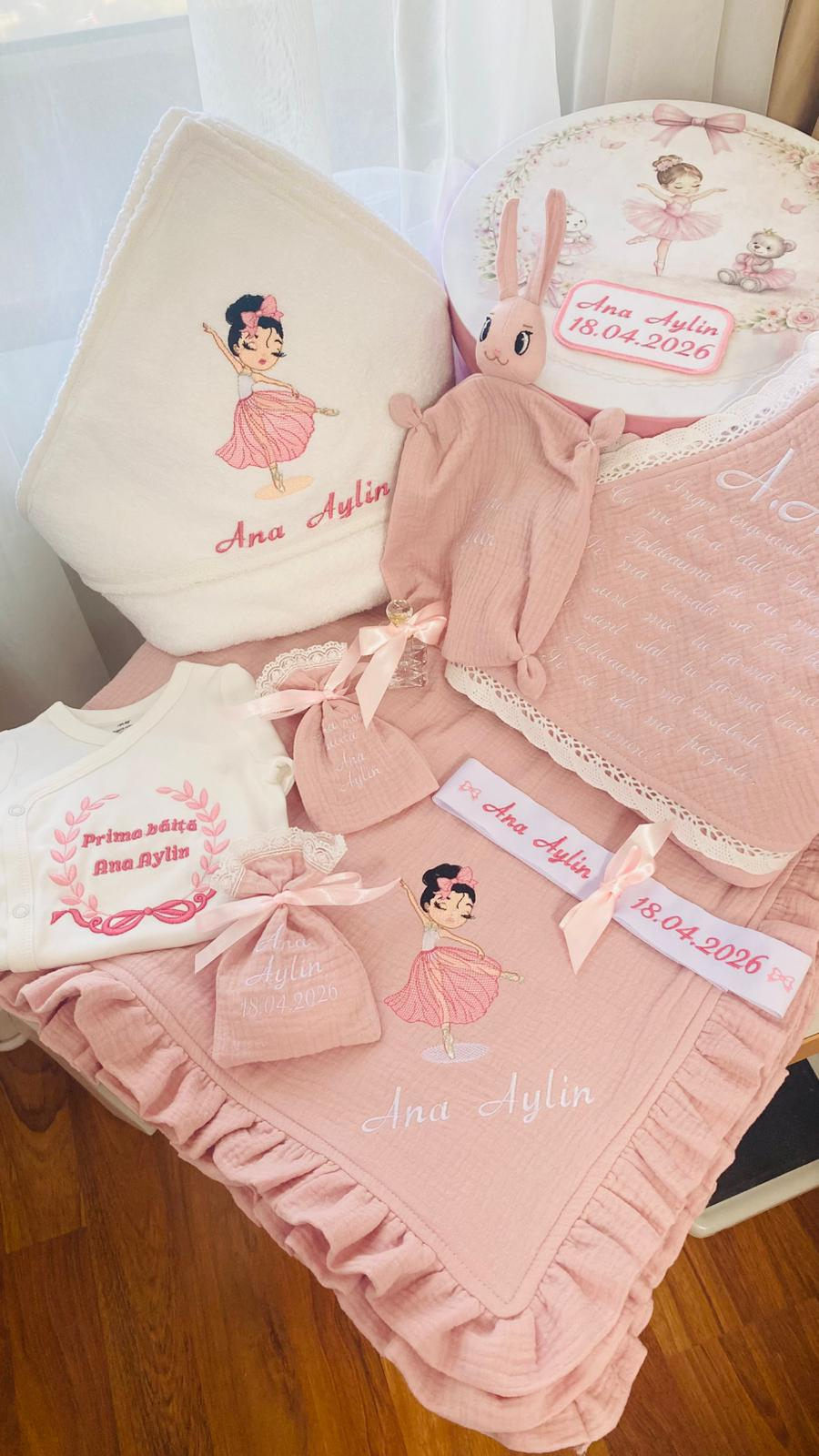 paturica fina si eleganta din 4 straturi de muselina, cu volanase pe contur, avand o dimensiune de 100 x 100 cm, brodata cu o eleganta balerina. Paturica este personalizata cu numele fetitei;