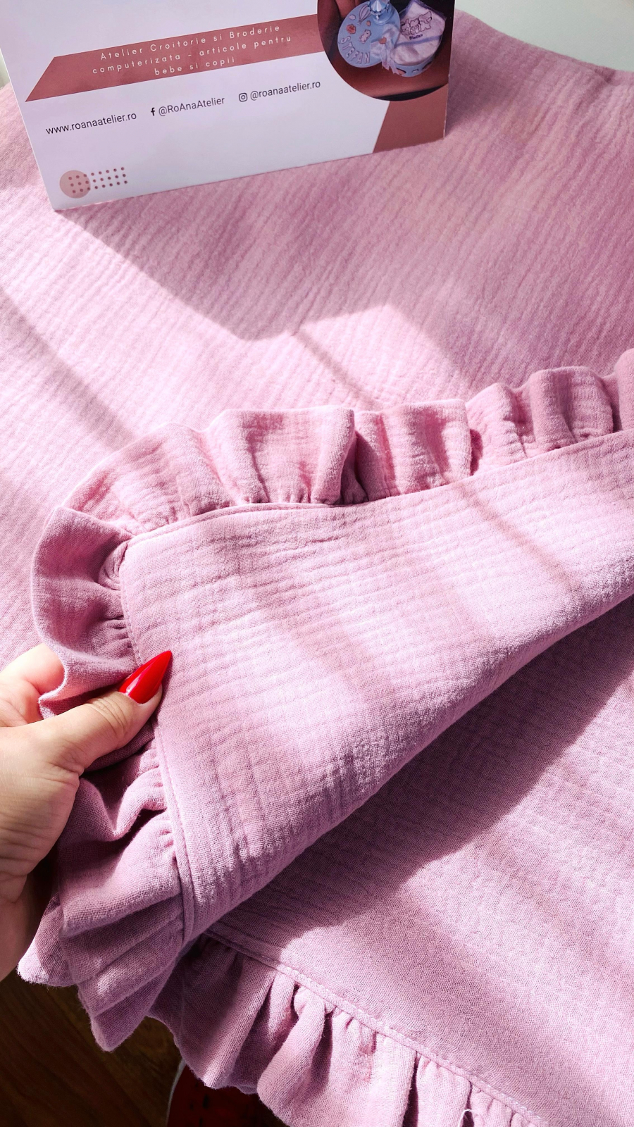 paturica fina si eleganta din 4 straturi de muselina, cu volanase pe contur, avand o dimensiune de 100 x 100 cm, brodata cu o gratioasa balerina. Paturica este personalizata cu numele fetitei;