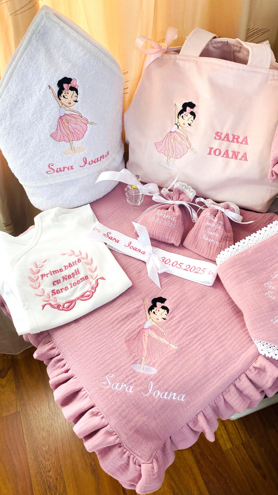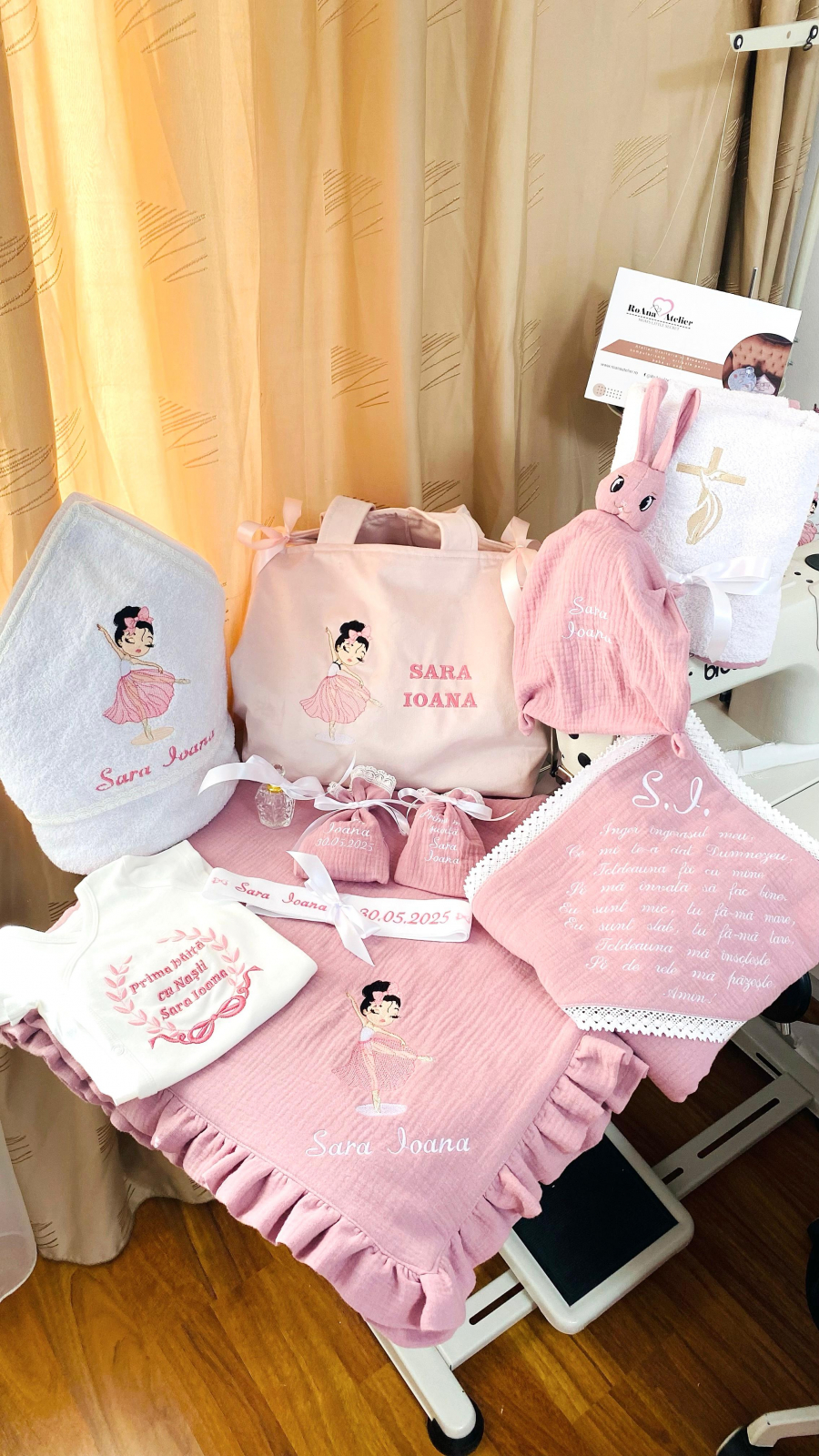 Accesoriile produselor din trusoul de botez (de exemplu dantela, panglica, ate brodat, etc) se pot modifica in functie de disponibilitate, insa pastreaza tematica initiala, cromatica modelului, calitatea superioara si sunt selectate in armonie cu intreg designul.