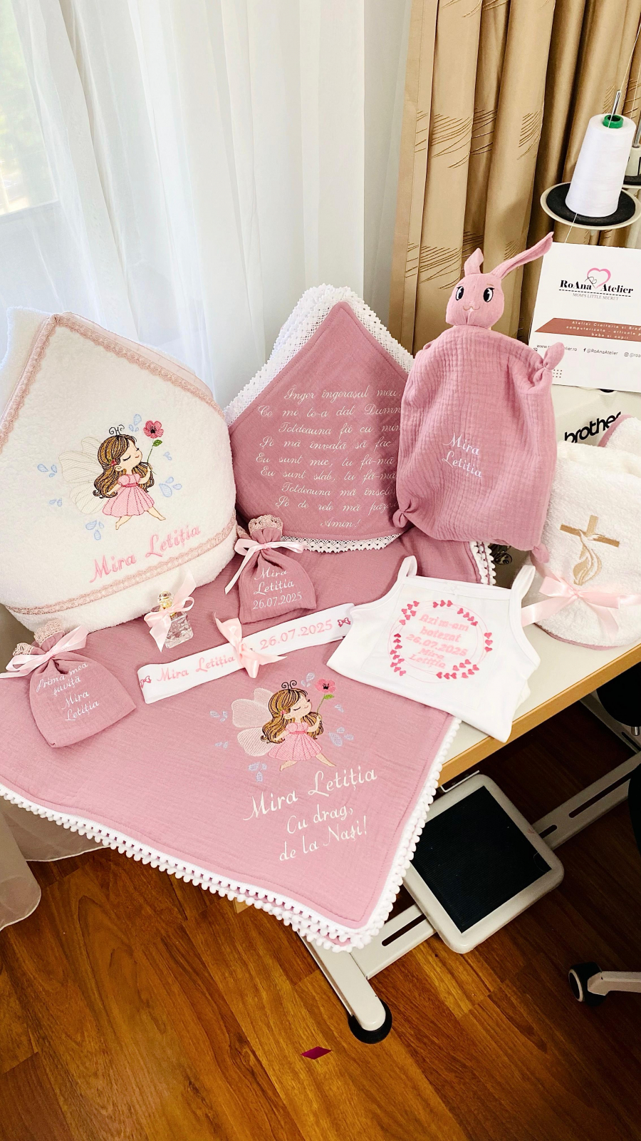paturica fina si eleganta din 4 straturi de muselina, cu contur din ciucurasi albi moi, cu o dimensiune de 100 x 100 cm, brodata cu o zână (fetita fluturas cu airpioare ținând cu drag o floricică în mânuță), in nuante de roz, alb si roz trandafiriu. Paturica este personalizata cu numele fetitei;