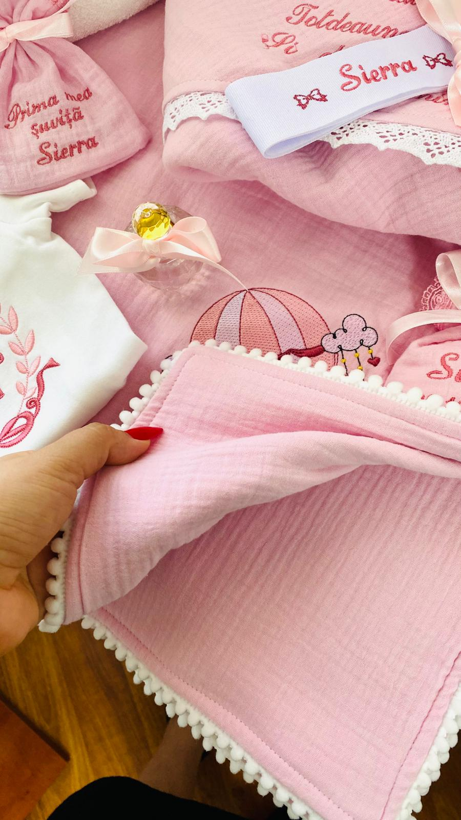 paturica fina si eleganta din 4 straturi de muselina, cu contur din ciucurasi albi moi, cu o dimensiune de 100 x 100 cm, brodata cu un ursulet ce se afla intr-un balon cu aer cald, in nuante de roz. Paturica este personalizata cu numele fetitei (Sierra);