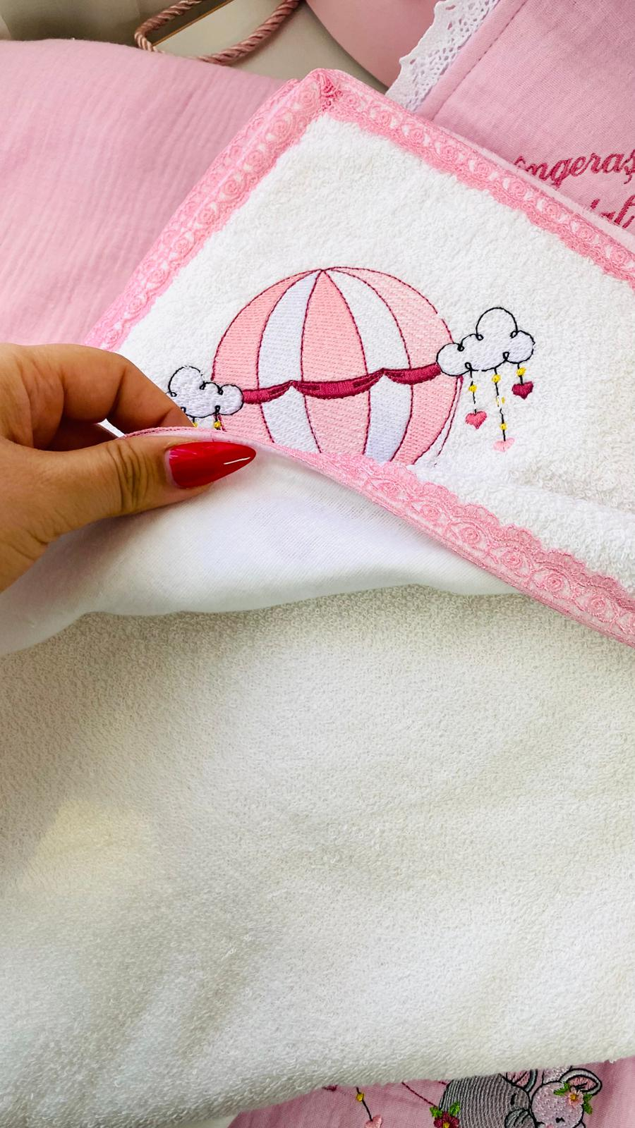 Trusou Botez Muselina Roz Ursulet in balon aer cald pentru fetita, lucrat din muselină moale și respirabilă, de o nuanta dulce de roz, ideală pentru pielea sensibilă a bebelușului, 100% bumbac si dantela roz, cu broderie in nuante de roz deschis si roz trandafiriu, format din 11 piese, astfel: