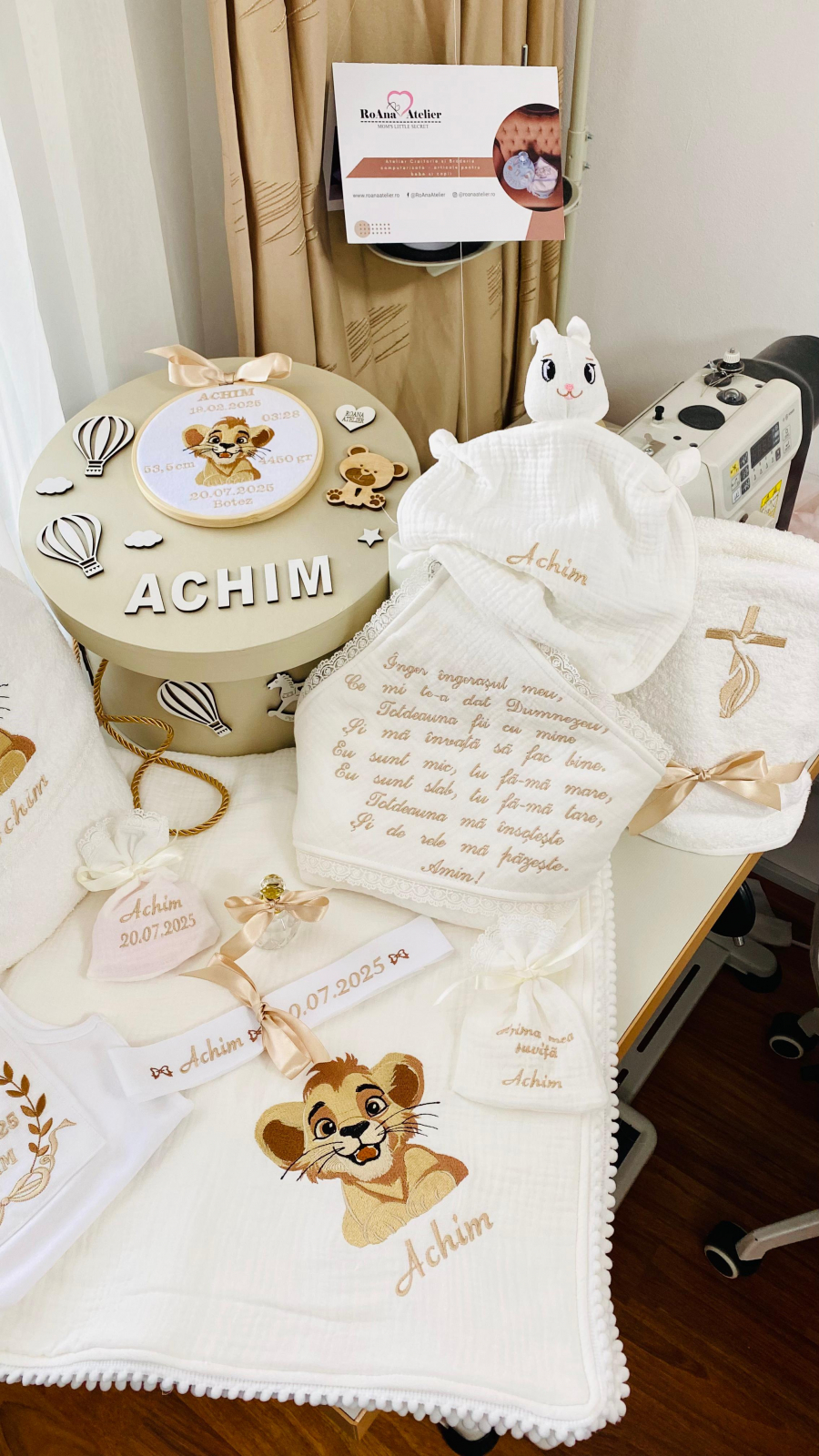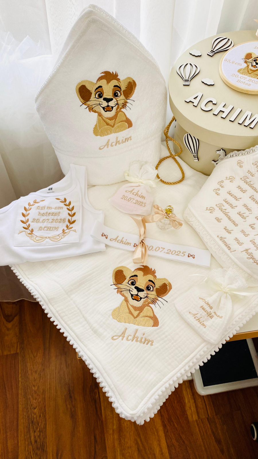 cutie rotunda bej / nude decorata manual cu elemente din lemn in forma de norisori, stelute, baloane cu aer cald, ursulet si snururi din matase. Cutia este personalizata cu numele copilului prin litere individuale albe. Pe capac este atasata si un gherghef brodat cu aceeasi tematica (leul Simba), personalizat cu datele de nastere ale bebelusului (ziua, ora, greutatea, lungimea). Cu siguranta va fi o amintire draga pentru parintii micutului increstinat.