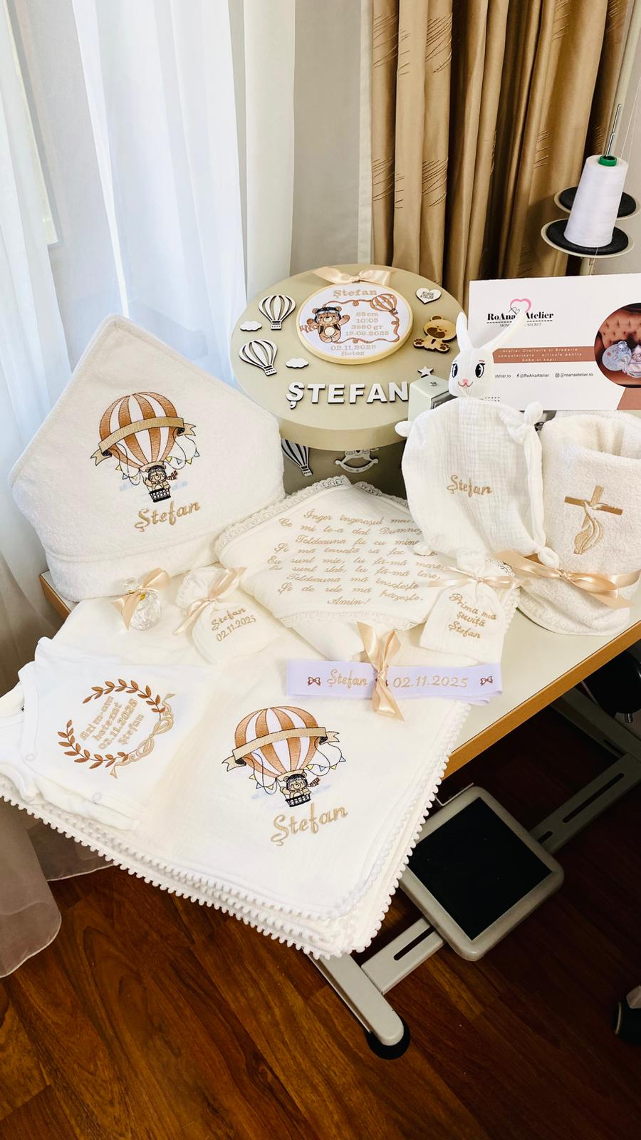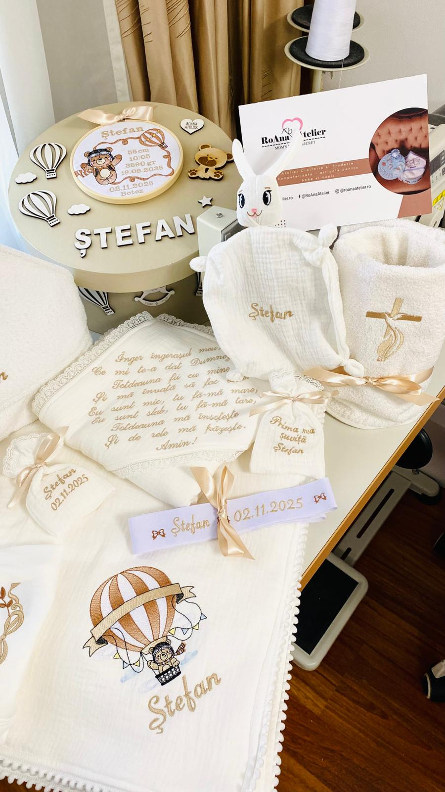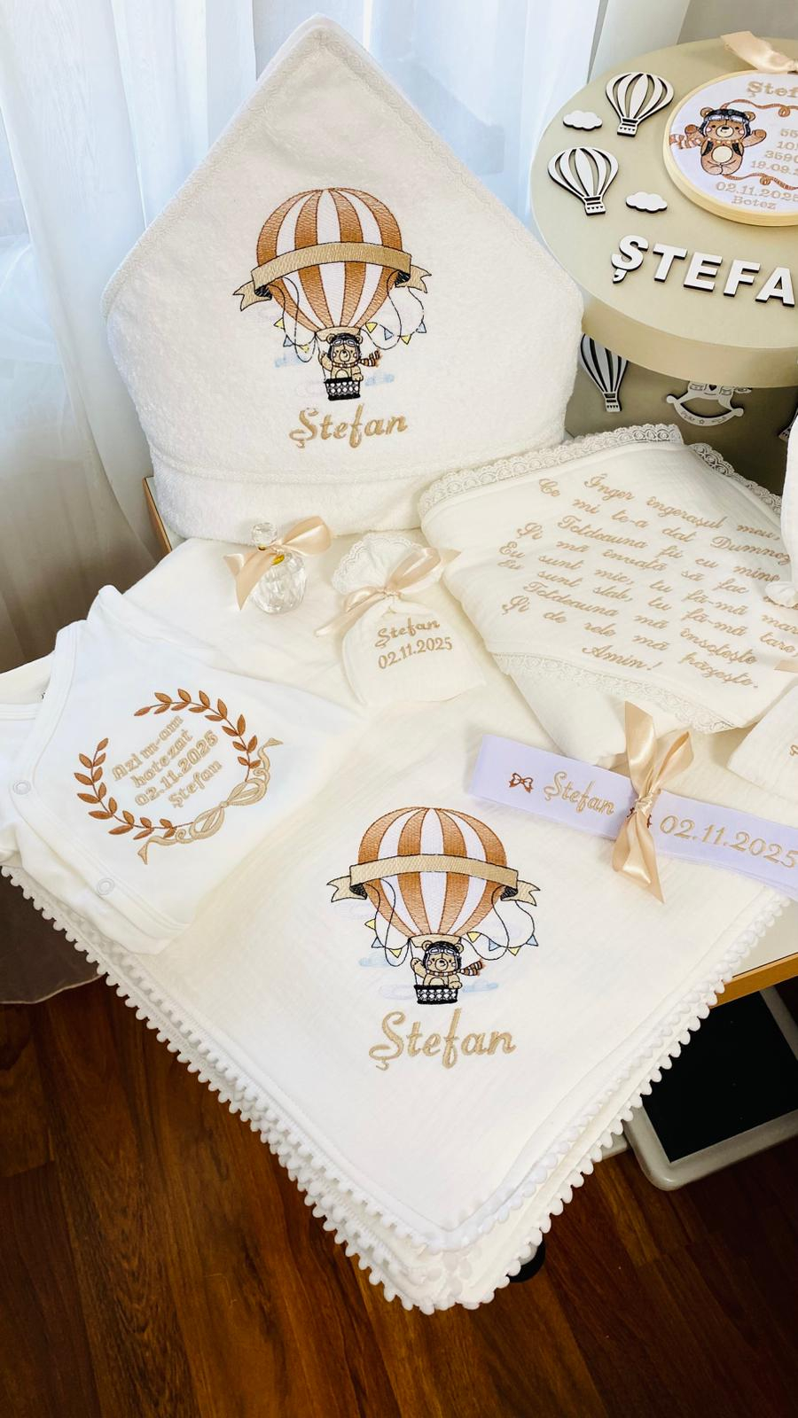 Trusou Botez Muselina Ursulet in balon aer cald bej lucrat din muselină moale și respirabilă, nuanta alb ivory, ideală pentru pielea sensibilă a bebelușului, 100% bumbac si dantela bleu, cu broderie in nuante elegante de bej, nude si auriu, format din 11 piese, astfel: