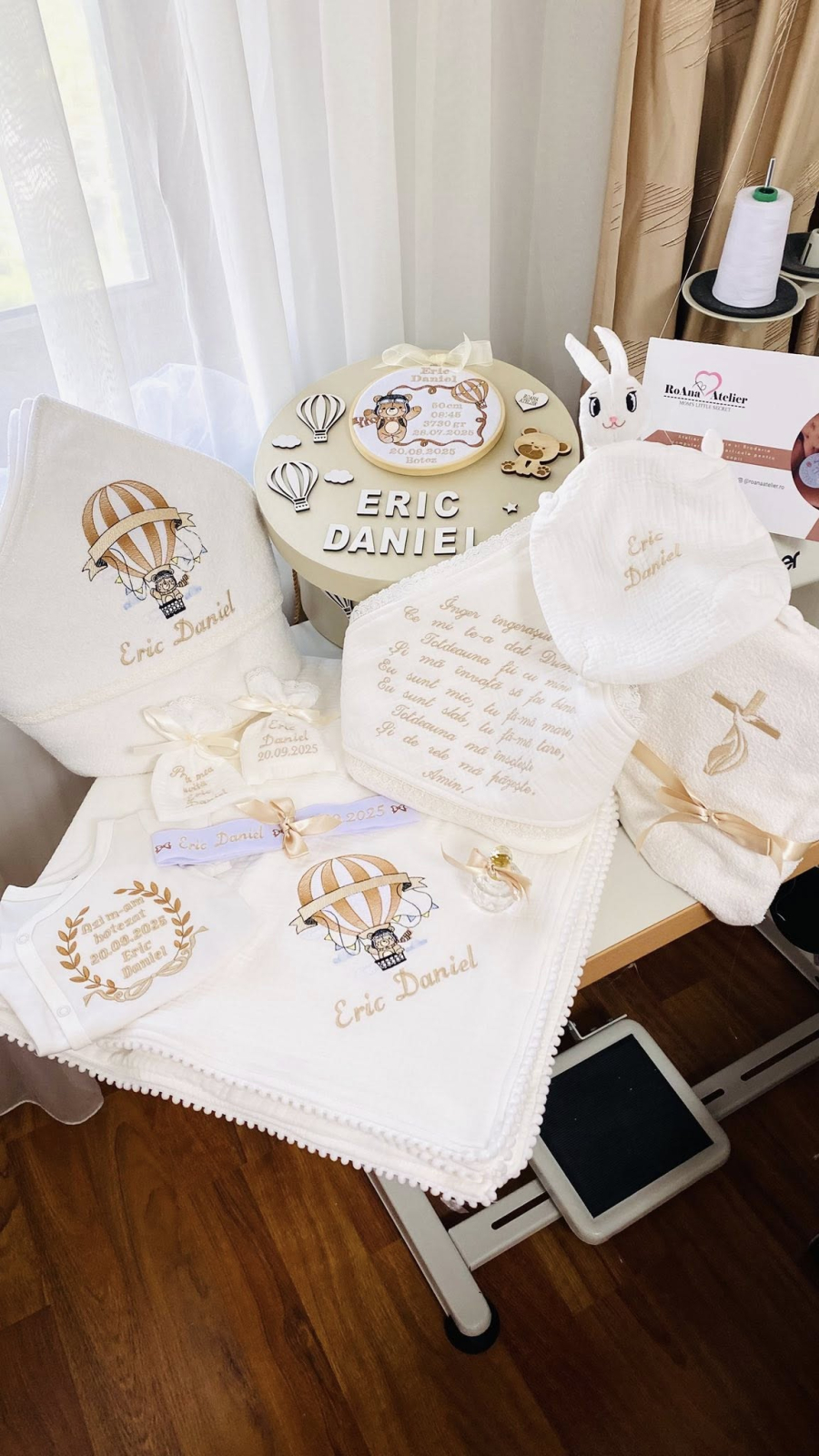 paturica fina si eleganta din 4 straturi de muselina, cu contur din ciucurasi albi moi, cu o dimensiune de 100 x 100 cm, brodata cu un ursulet ce se afla intr-un balon cu aer cald, in nuante de bej si auriu. Paturica este personalizata cu numele bebelusului;
