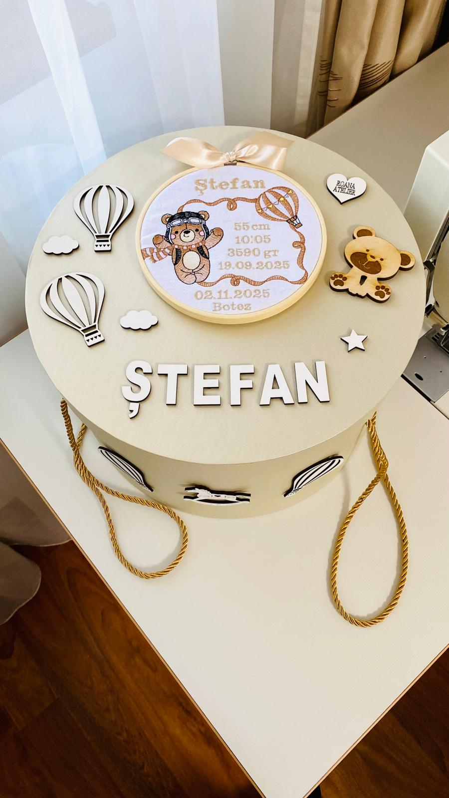 cutie rotunda bej / nude decorata manual cu elemente din lemn in forma de norisori, stelute, baloane cu aer cald, ursulet si snururi din matase. Cutia este personalizata cu numele copilului prin litere individuale albe. Pe capac este atasata si un gherghef brodat cu aceeasi tematica (balon cu aer cald si ursulet avitator), personalizat cu datele de nastere ale bebelusului (ziua, ora, greutatea, lungimea). Cu siguranta va fi o amintire draga pentru parintii micutului increstinat.