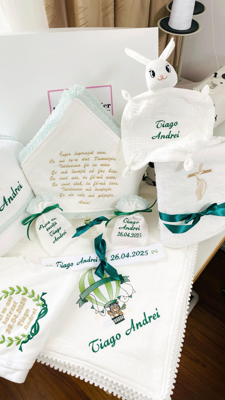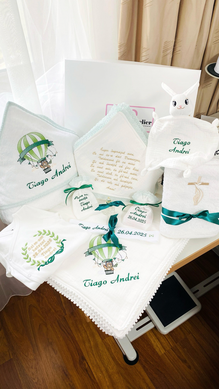 • paturica fina si eleganta din 4 straturi de muselina, cu contur din ciucurasi albi moi, cu o dimensiune de 100 x 100 cm, brodata cu un ursulet ce se afla intr-un balon cu aer cald, in nuante de verde. Paturica este personalizata cu numele bebelusului;