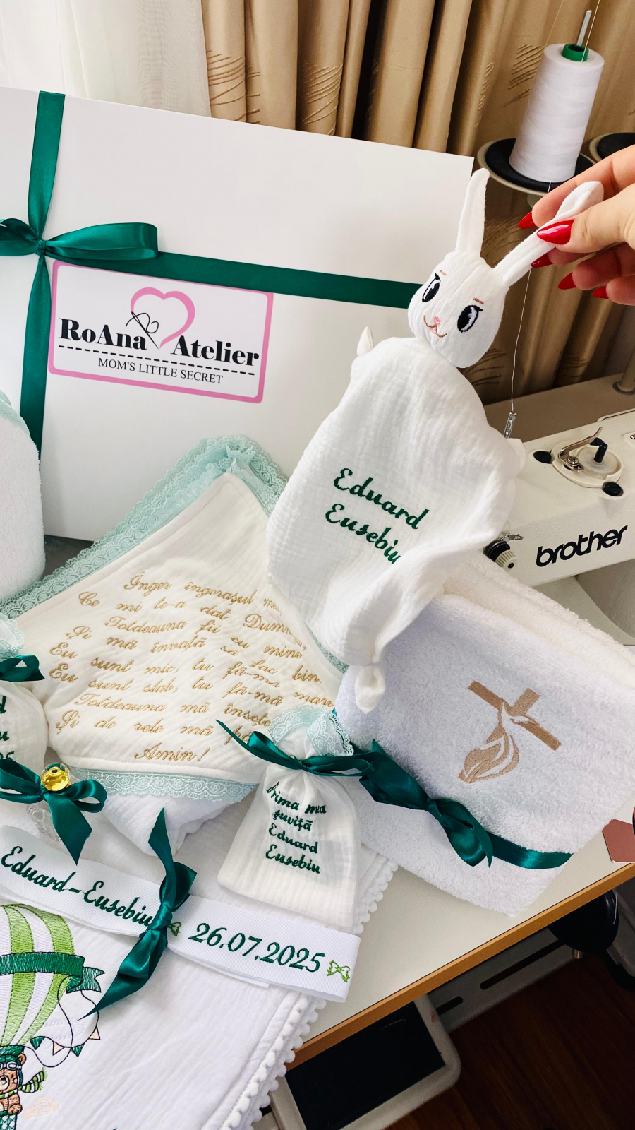 • prosop cu capison din 100% bumbac, moale si cu putere mare de absorbtie, dimensiune 100 x 100 cm, cu margine de dantela fina, brodat cu aceeasi grafica / tematica si personalizat cu numele nou nascutului;
