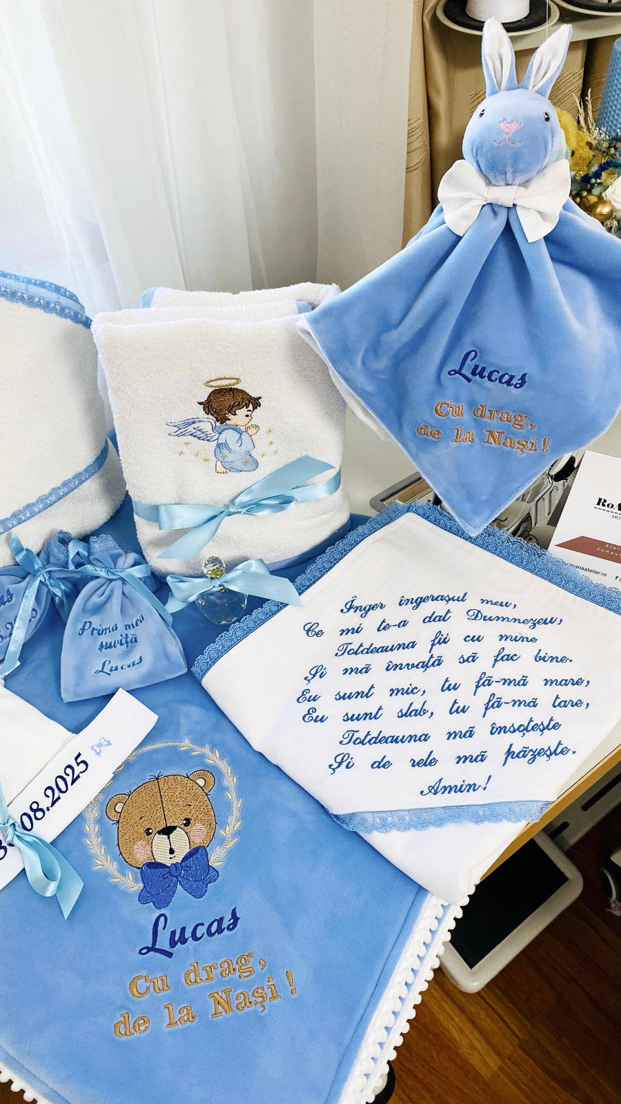 - paturica fina si eleganta din catifea albastra, cu bumbac pe interior si ciucurasi moi si albi pe margine, cu o dimensiune de 100 x 100 cm, brodata cu aceasi tematica, alaturi de mesajul "Cu drag, de la Nasi!". Paturica este personalizata cu numele celui mic; (*)