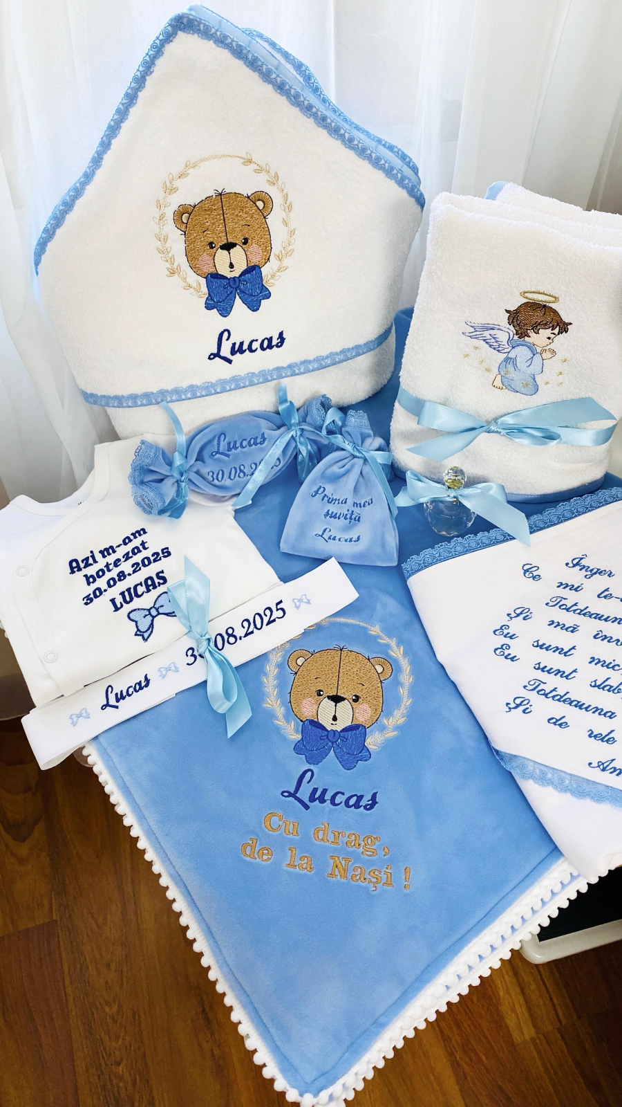 - prosop cu capison din 100% bumbac, moale si cu putere mare de absorbtie, dimensiune 100 x 100 cm, cu margine de dantela fina albastra, brodat cu un simpatic ursuleț cu fundiță. Prosopul este personalizat prin brodare cu numele bebelusului;