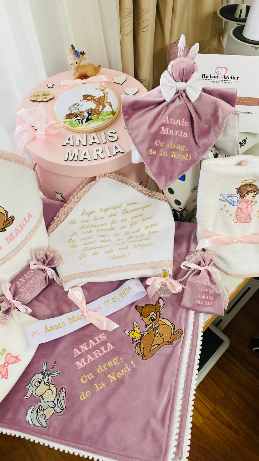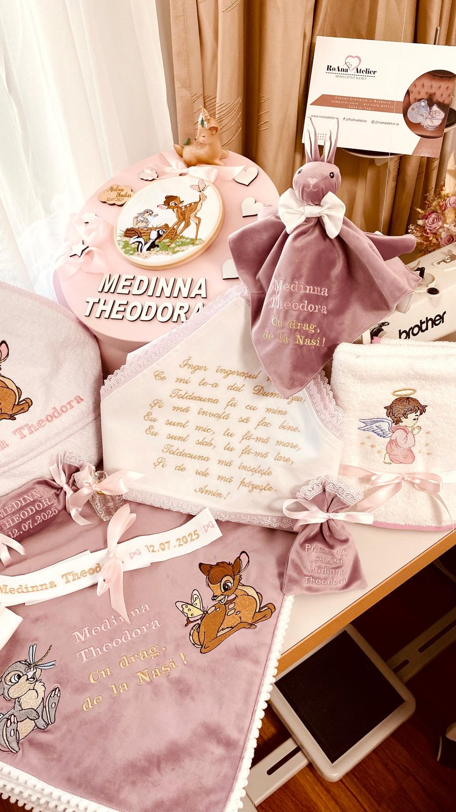 Trusou Botez Bambi in cutie rotunda roz, eleganta, format din 11 piese lucrate din catifea premium intr-o nuanta de lila si bumbac 100%, personalizate prin brodare cu numele bebelusului si data botezului. Cutia este decorata cu un mini tablou brodat cu un peisaj din Bambi si personalizata cu numele nou nascutului si data botezului.