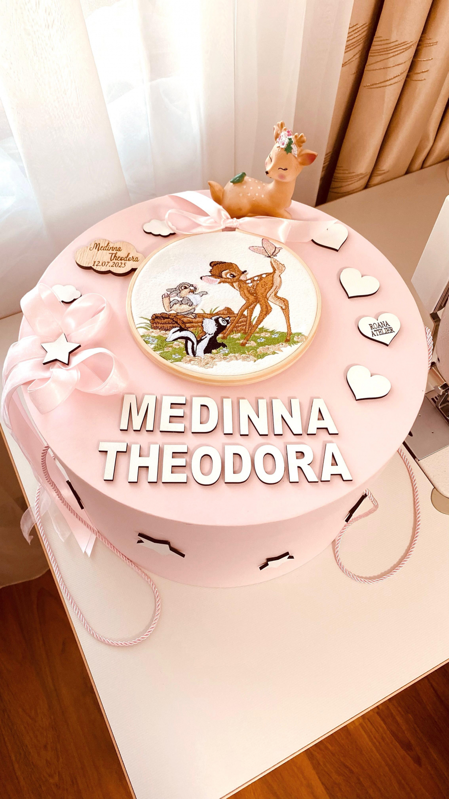 - cutie rotunda roz, cu sidef delicat, decorata manual cu elemente de lemn in forma de norisori, stelute, inimioare, norisor gravat cu numele copilului si data Botezului, fundita si snururi roz din matase. Numele copilului (Celine) este realizat din litere individual din lemn alb si aplicat pe cutie. Cutia de botez are pozitionat pe centru un mini tablou brodat (peisaj din desenele animate: iepurasul Bocanila, sconcsul Flower si Bambi) incadrat intr-un gherghef pentru un efect deosebit si o figurina (caprioara) pentru a pastra tematica botezului.