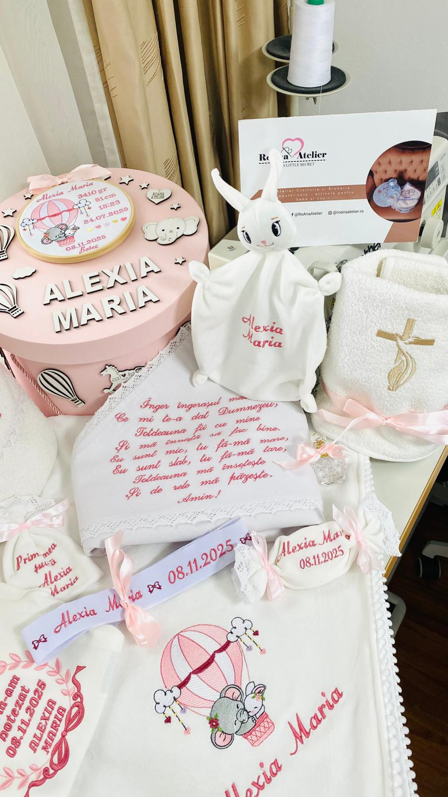 Trusou Botez Fetita Alb Elefantel Balon cu aer cald realizat din catifea premium alba, bumbac si dantela alba, cu broderie in nuante de roz trandafiriu, format din 11 piese, astfel: