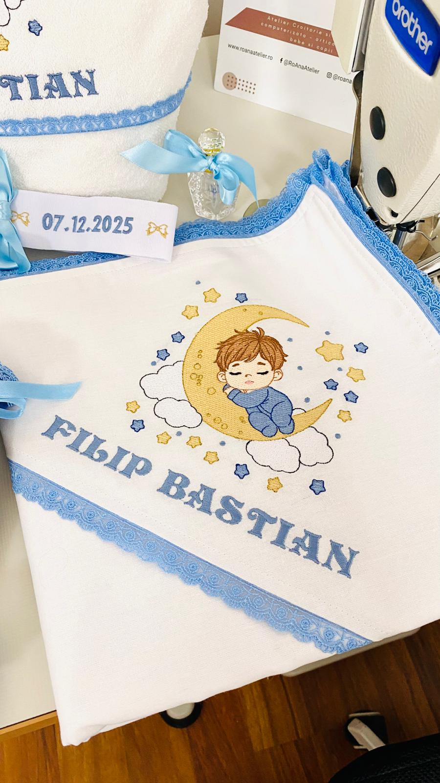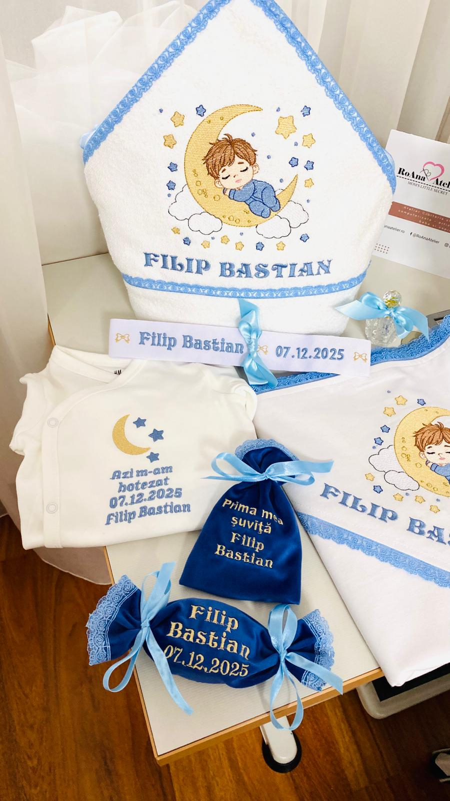 Realizat în nuanțe armonioase de alb și bleu, setul este complet personalizat cu numele copilului și data botezului, prin broderie fină, atent executată în atelier.