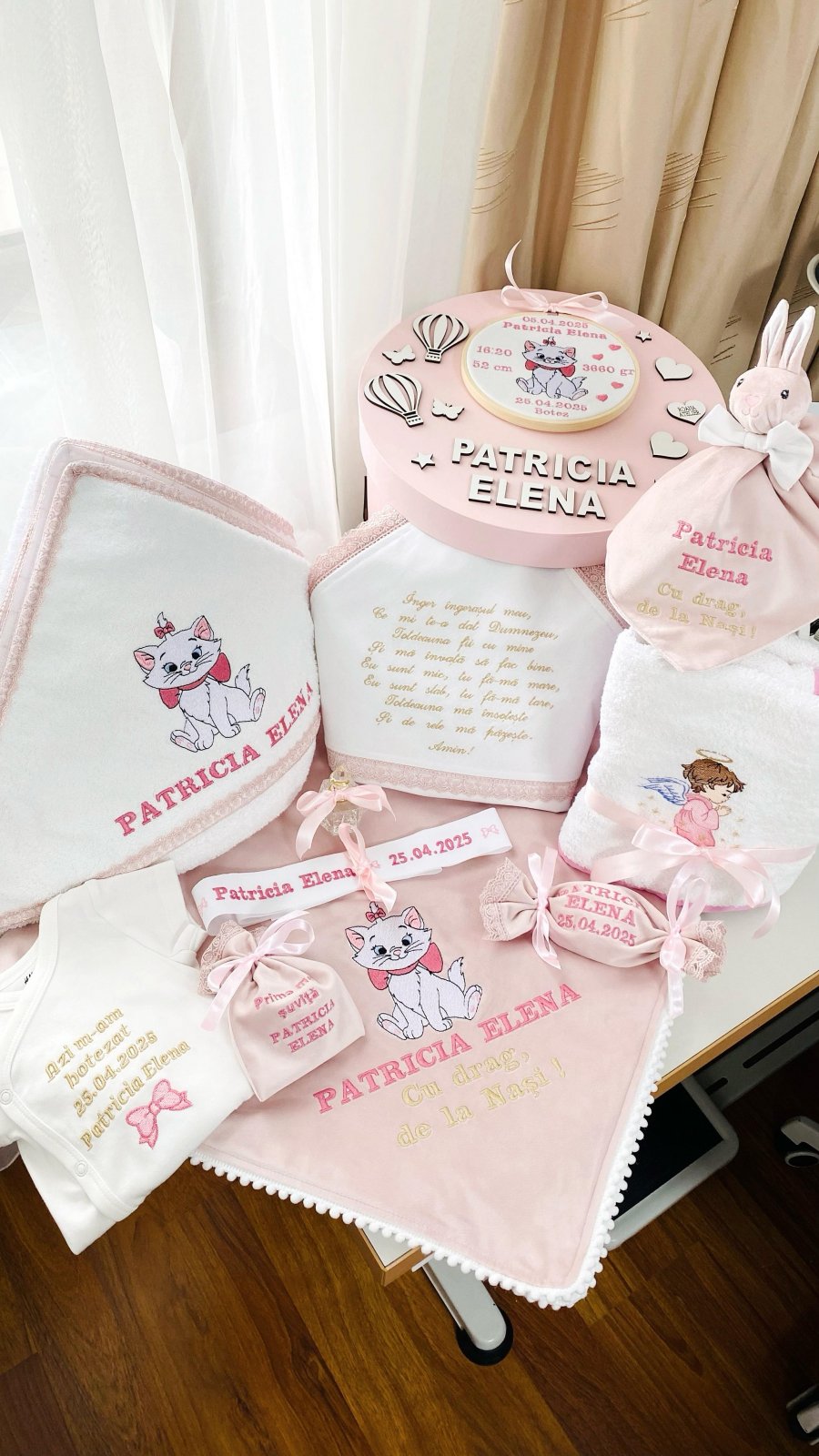 Cutia este decorata cu un gherghef brodat cu aceeasi tematica (pisica Marie), personalizat cu datele de nastere ale bebelusului (ziua, ora, greutatea, lungimea). Cu siguranta va fi o amintire draga pentru parintii micutei increstinata.