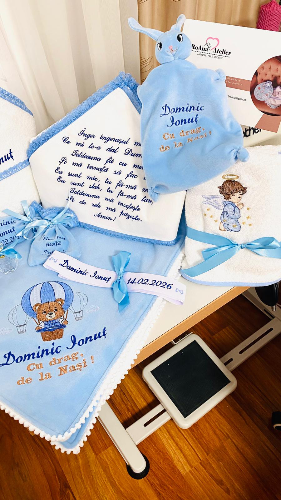 - paturica fina si eleganta din catifea albastra, cu bumbac pe interior si ciucurasi moi si albi pe margine, cu o dimensiune de 100 x 100 cm, brodata cu aceasi tematica, alaturi de mesajul "Cu drag, de la Nasi!". Paturica este personalizata cu numele celui mic; (*)