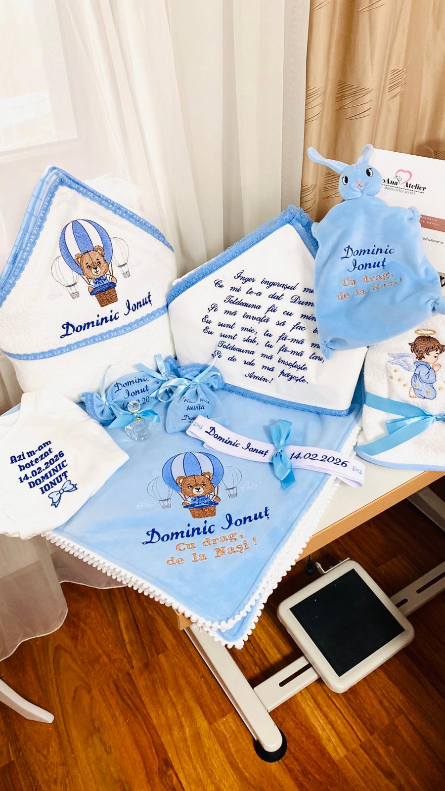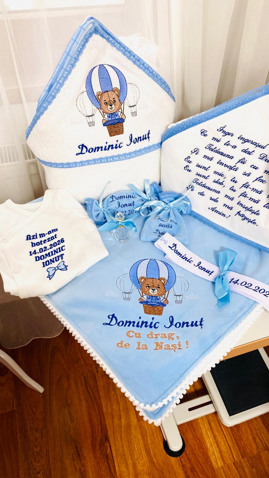 - prosop cu capison din 100% bumbac, moale si cu putere mare de absorbtie, dimensiune 100 x 95 cm, cu margine de dantela fina albastra, brodat cu un simpatic ursulet ce se afla intr-un balon cu aer cald. Prosopul este personalizat prin brodare cu numele bebelusului;